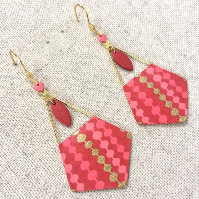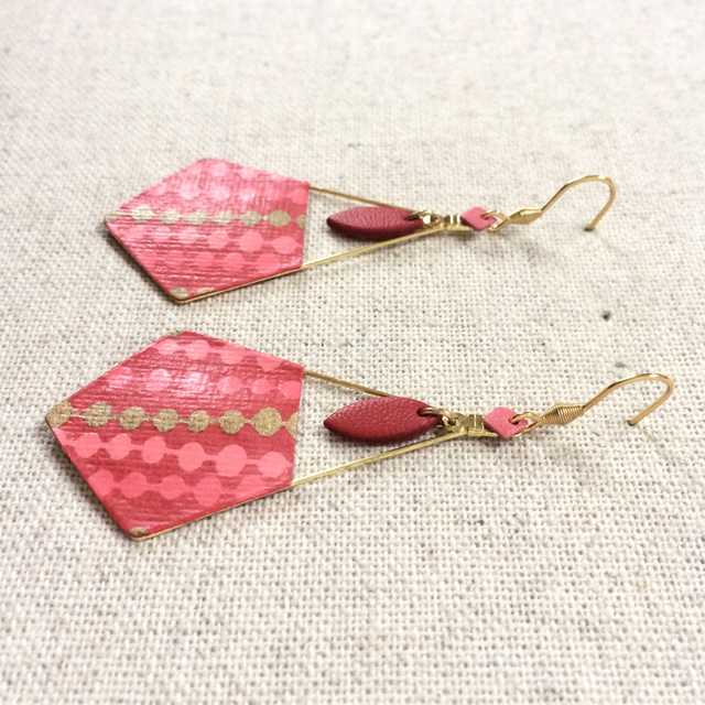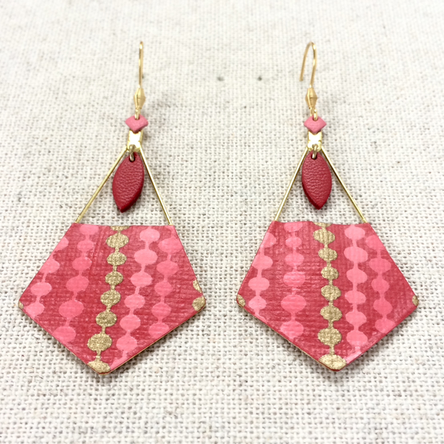 Boucles d’oreilles « Romanesca » dorées, papier rouge, rose et doré, cuir assorti