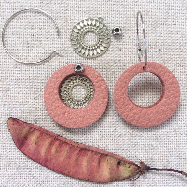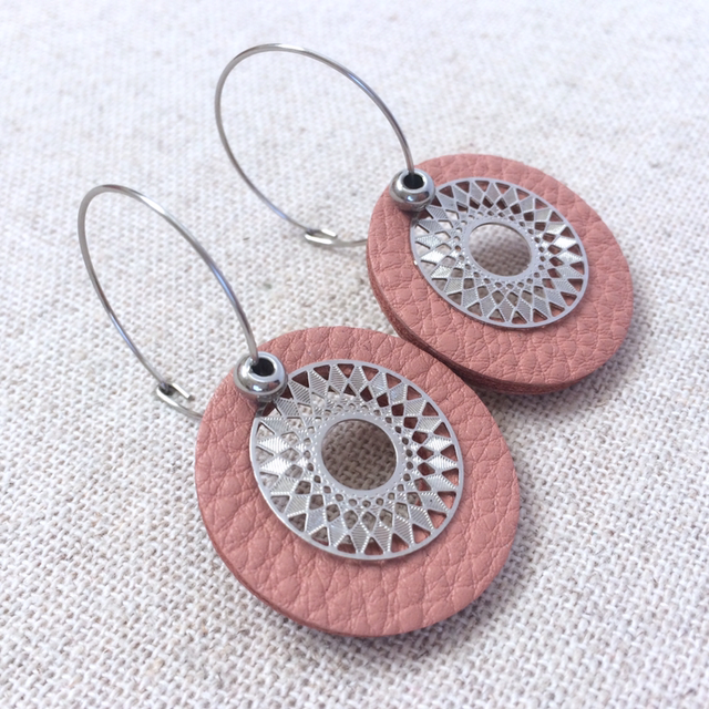 Boucles d’oreilles « Rondo » argentées, cuir vieux rose + estampe