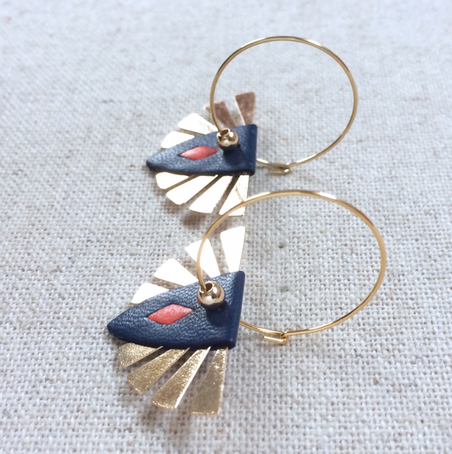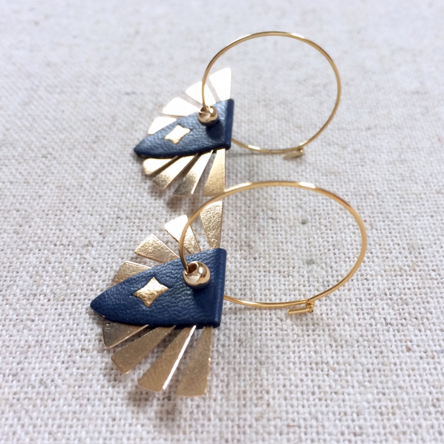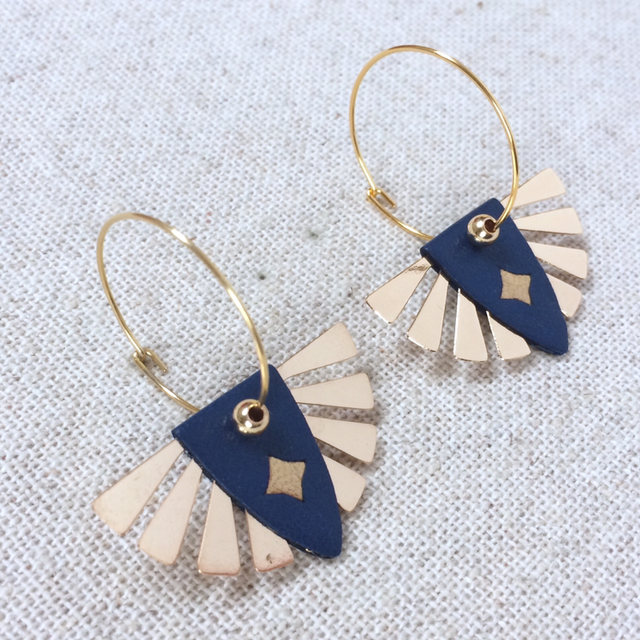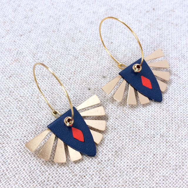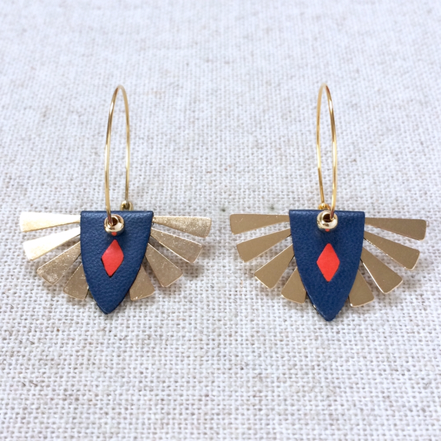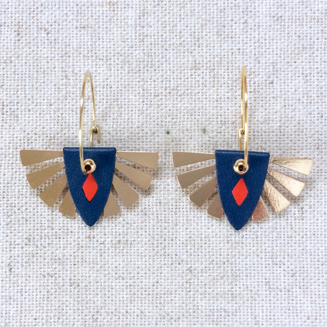 Boucles d’oreilles « Soul » dorées, réversibles, cuir bleu nuit avec insert doré / orange vif