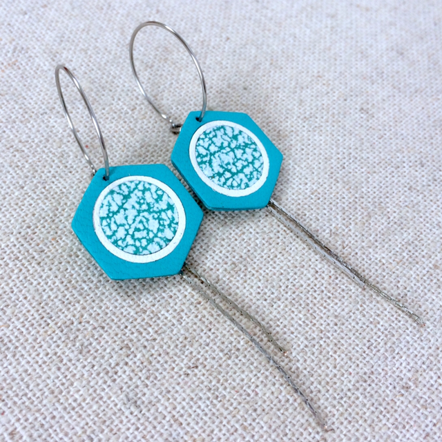 Boucles d’oreilles « Vago » argentées, papier blanc et turquoise, cuir bleu canard