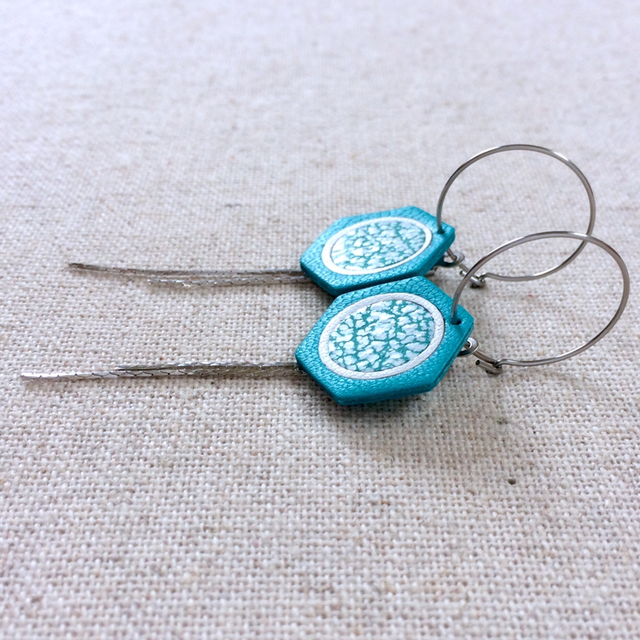 Boucles d’oreilles « Soupir » argentées, cuir turquoise vif et moucheté turquoise et blanc