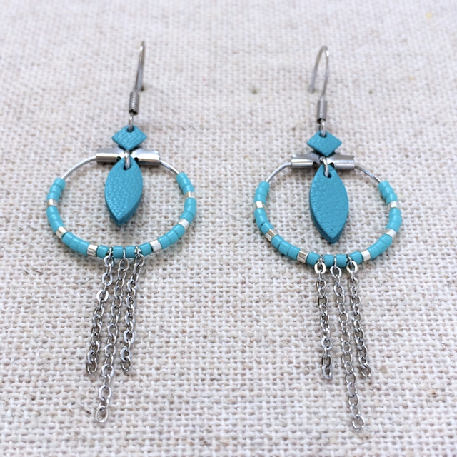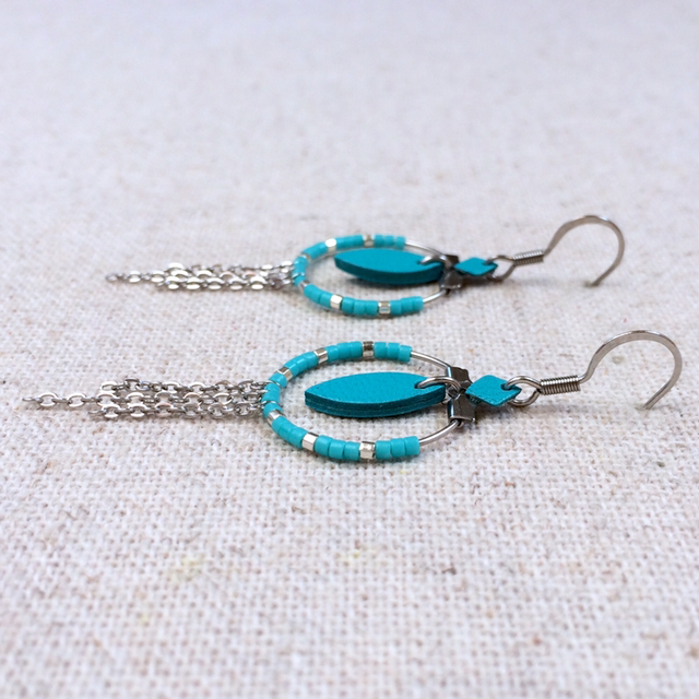 - Navette et losange de cuir de chèvre, turquoise vif.