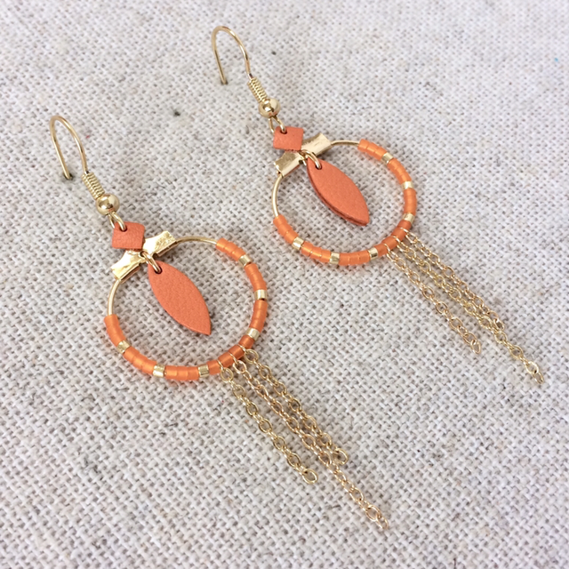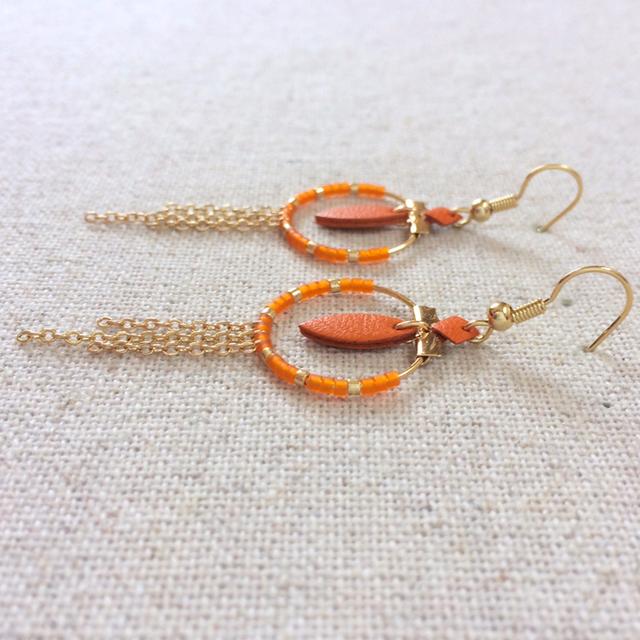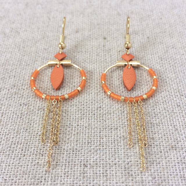 Boucles d’oreilles « Stretto » dorées, cuir orange