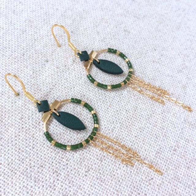 Boucles d’oreilles « Stretto » dorées, cuir vert sapin