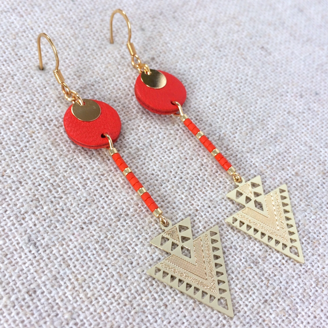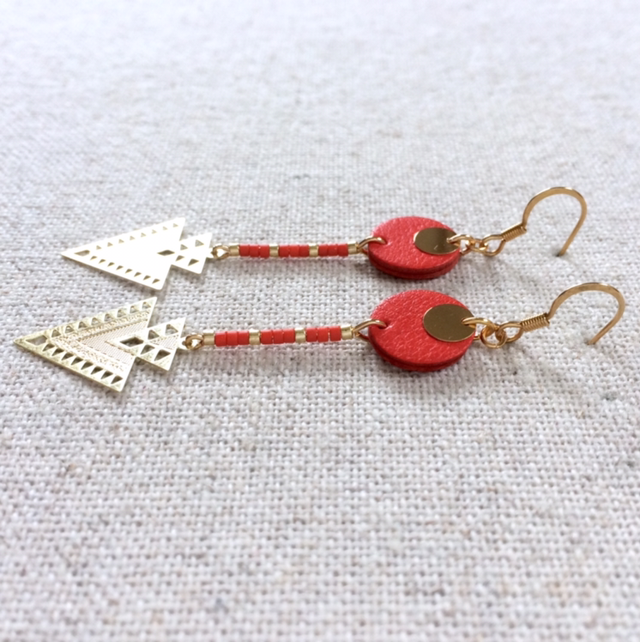 Boucles d’oreilles « Tierce » dorées, cuir orange vif