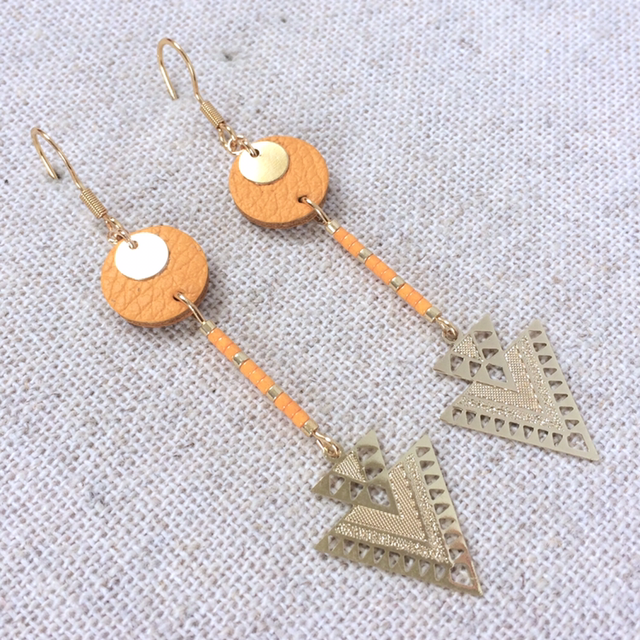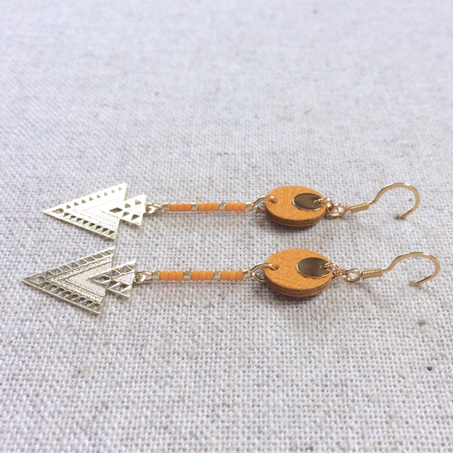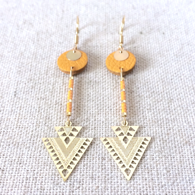 Boucles d’oreilles « Tierce » dorées, cuir safran