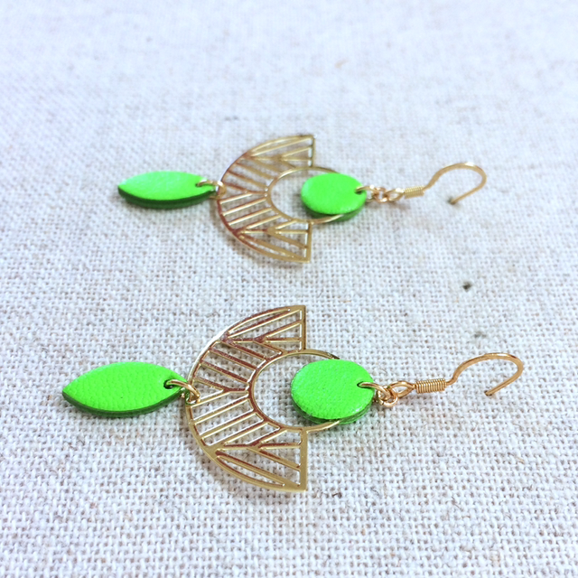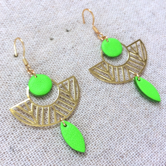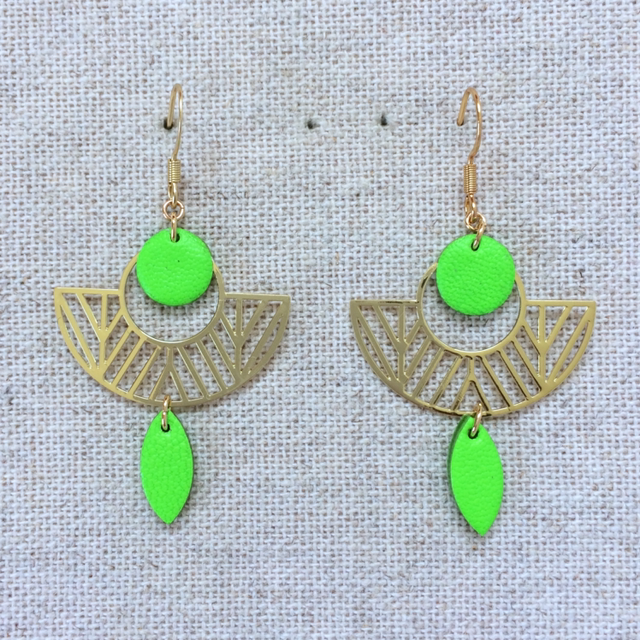 Boucles d’oreilles « Tourne-disque » dorées, cuir vert fluo