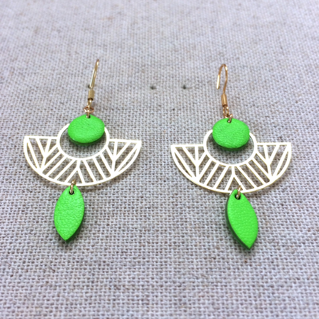 - Deux pastilles de cuir d’agneau (10 mm) couleur vert fluo collées au recto et au verso d’une estampe "roue de paon" en laiton plaqué or.