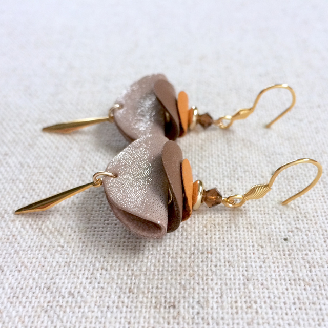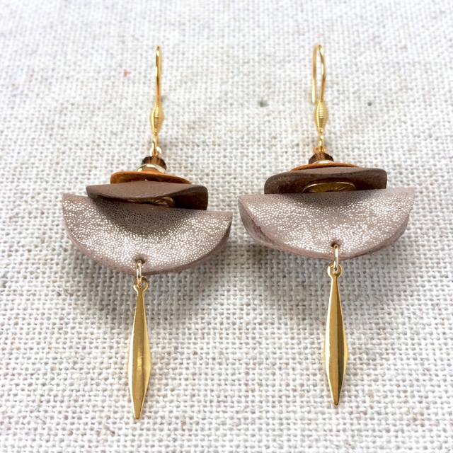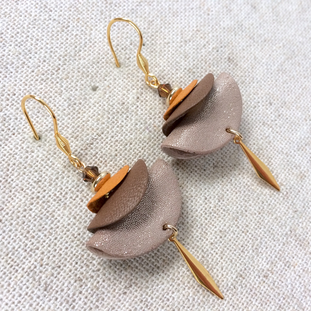 Boucles d’oreilles « Trio lungo » dorées, cuir beige pailleté / camel / ocre