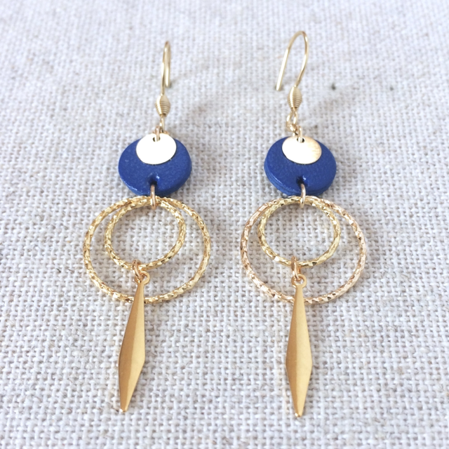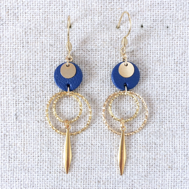 Bouclés d’oreilles « Ukulele lungo » dorées, cuir bleu outremer