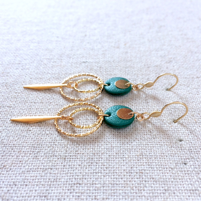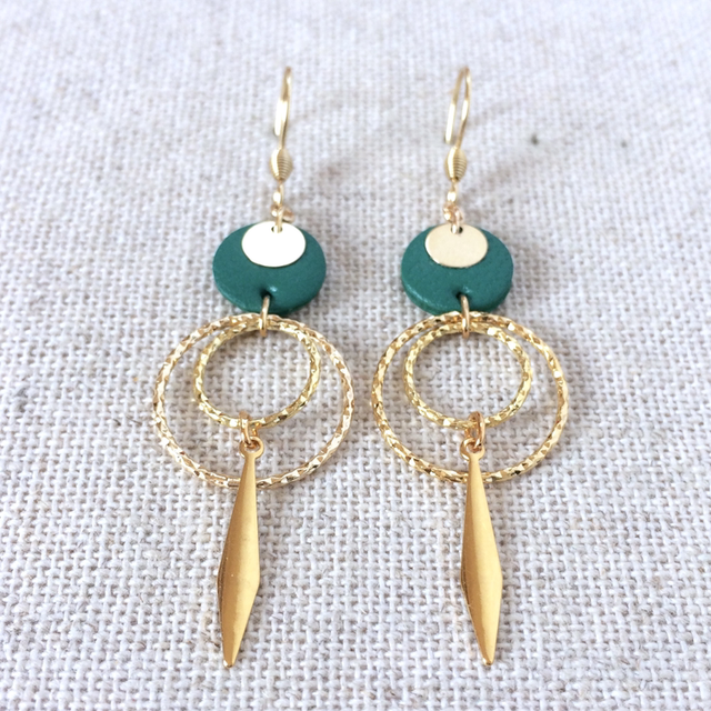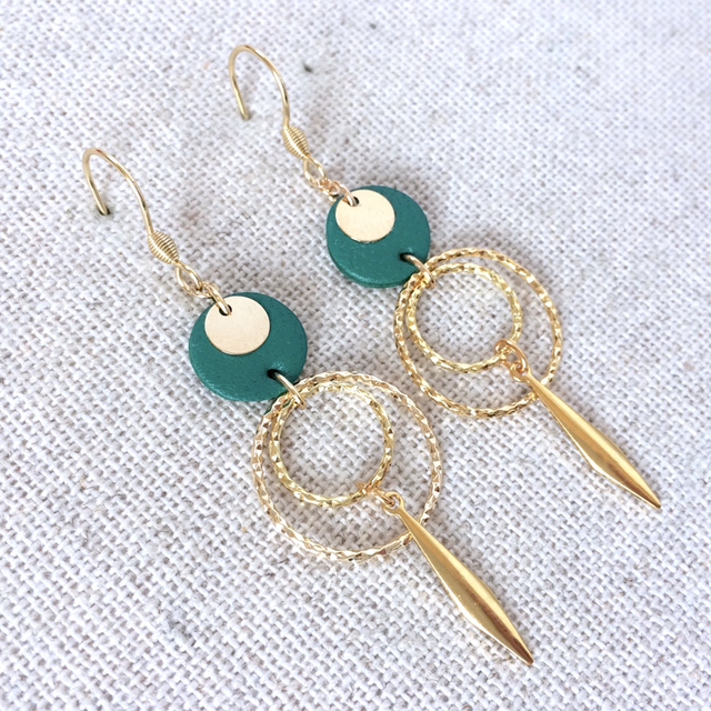 Boucles d’oreilles « Ukulele lungo » dorées, cuir vert franc