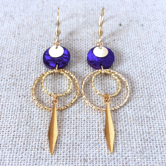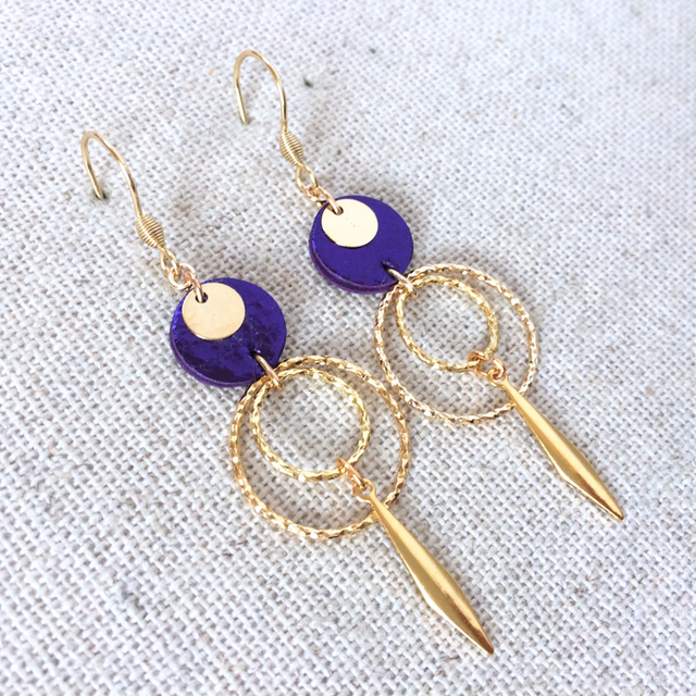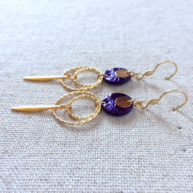 Boucles d’oreilles « Ukulele lungo » dorées, cuir violet métallisé