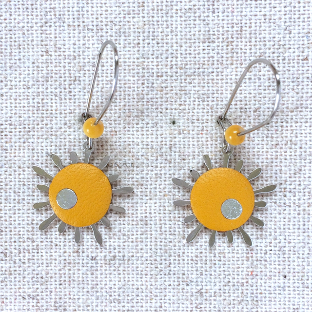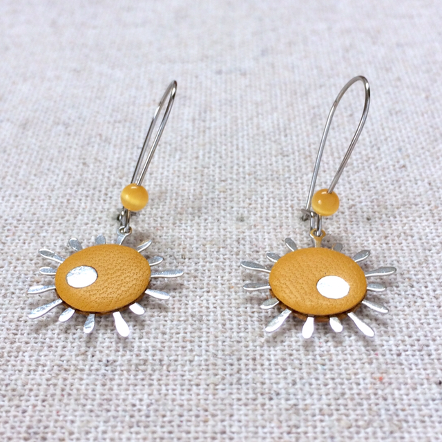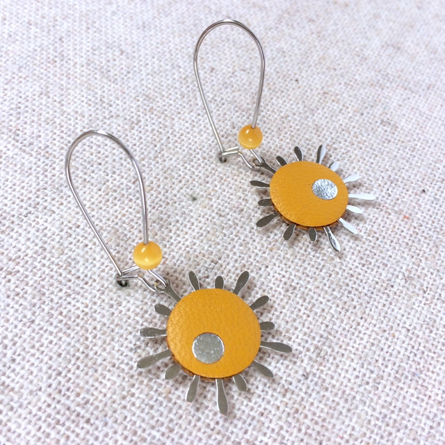 - Estampe fleur de pissenlit en laiton rhodié partiellement recouverte d’un rond de cuir d’agneau jaune moutarde de 13 mm, marqueté d’un petit rond de cuir de chèvre argenté de 4 mm.