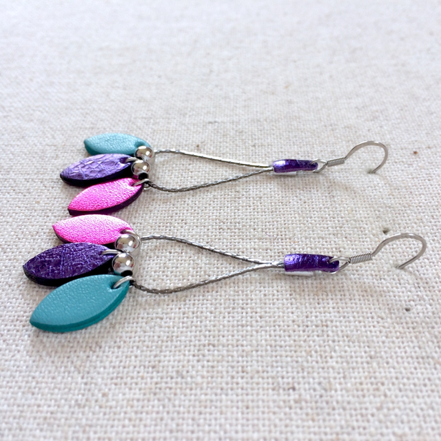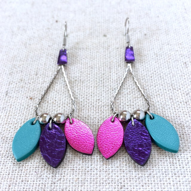 Boucles d’oreilles « Vezzoso » argentées, cuir turquoise vif, violet métallisé et fuchsia métallisé