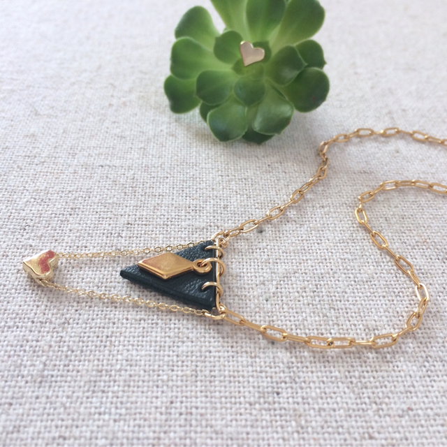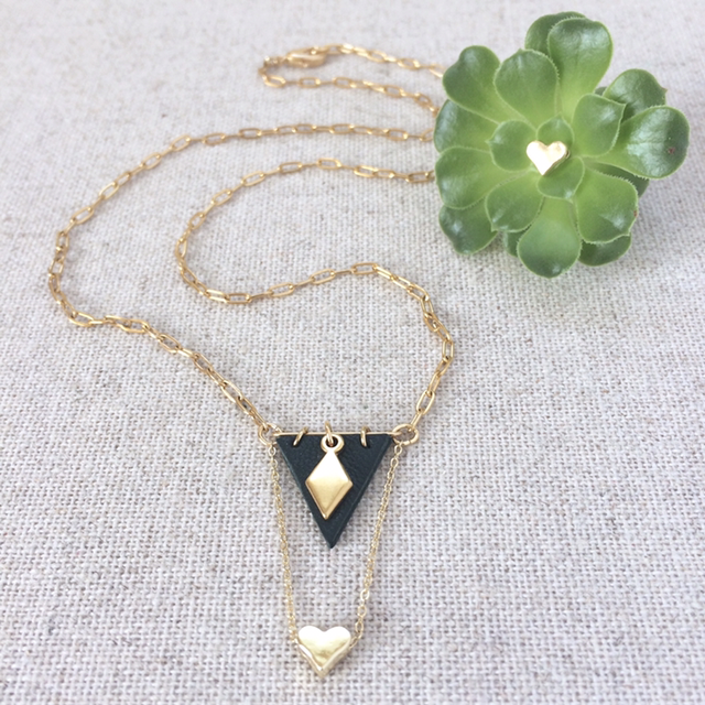 Collier longs maillons, triangle cuir d’agneau vert et chaînette et cœur en gold filled