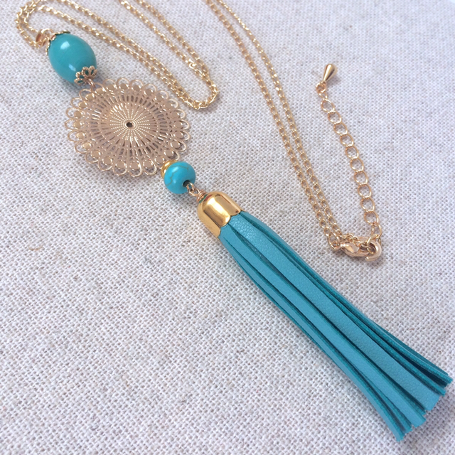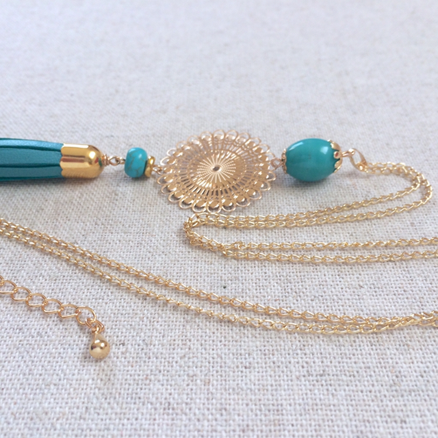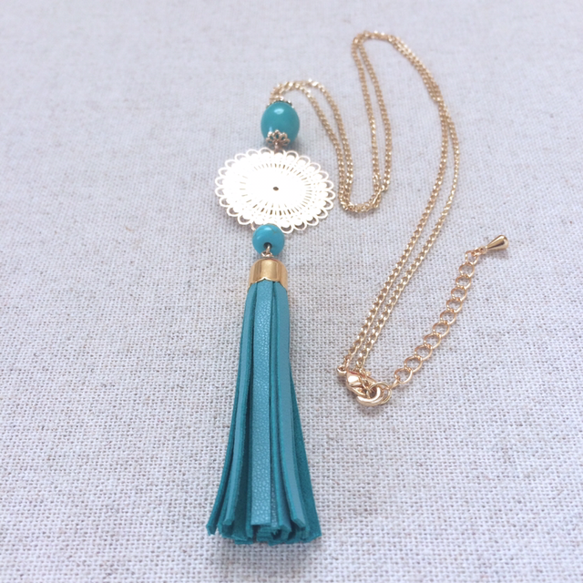 Sautoir « Cavatina » pompon cuir bleu turquoise