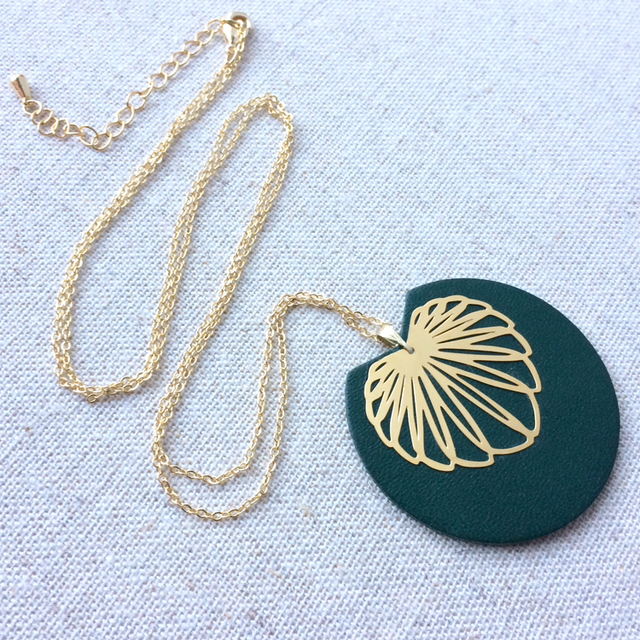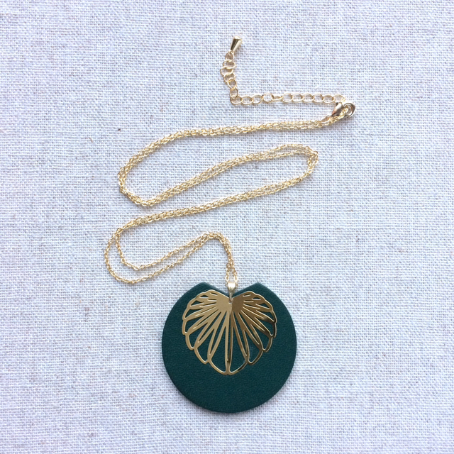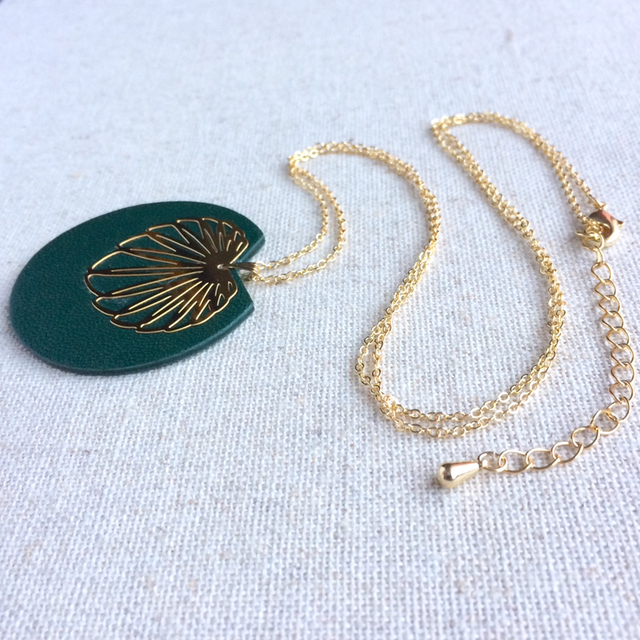 - Rond de cuir d’agneau, vert sapin (50 mm de diamètre), doublé et échancré par mes soins.