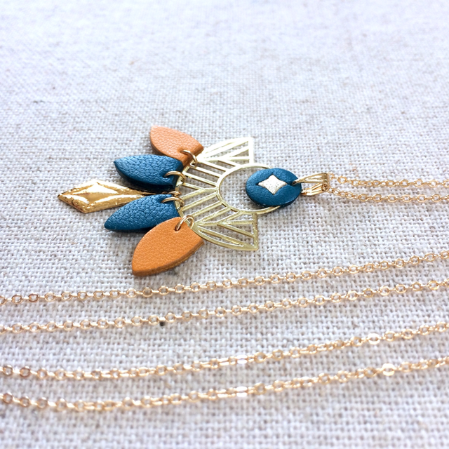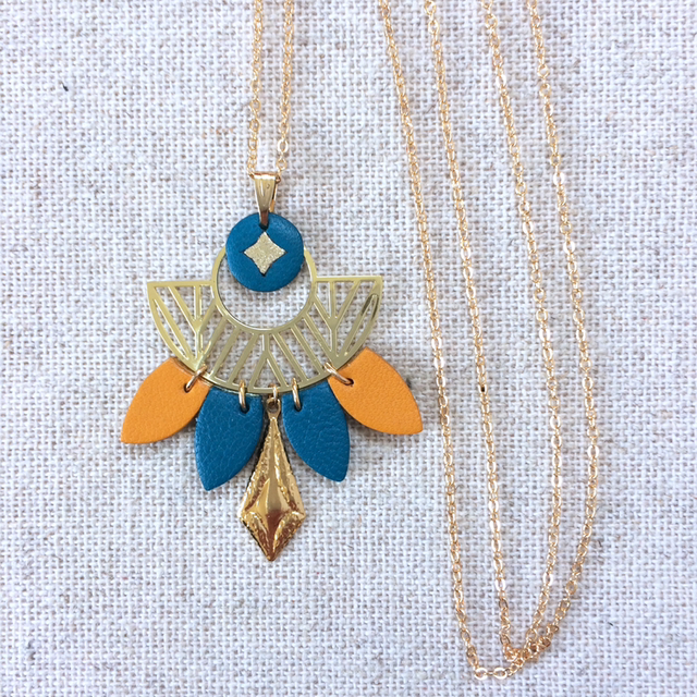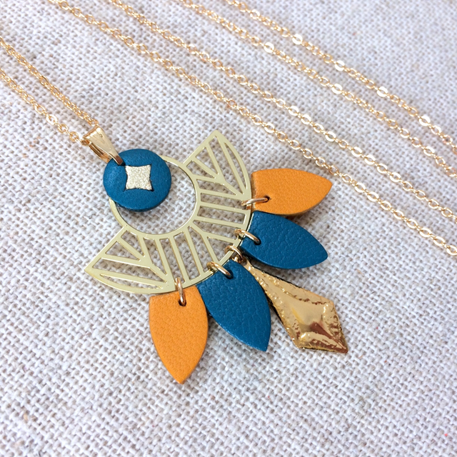 Sautoir « Tourne-disque » doré, cuirs couleur safran et bleu canard